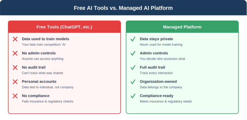 It depends on the platform. Free tools like ChatGPT can use your data to train their models, which means bid information, client data, and proprietary processes could be exposed. An organizationally managed AI platform keeps your data private, never uses it for training, and gives you administrative control over who accesses what. If your team is already using free AI tools, you likely have a data security gap you don’t know about.