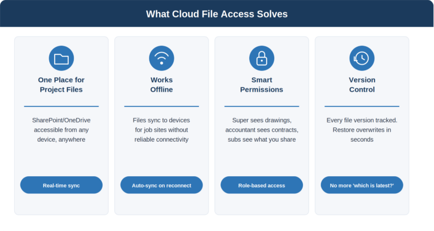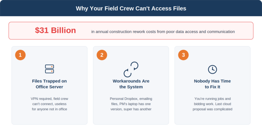 Somebody set up a file server years ago. All your project folders, drawings, contracts, and documents live there. If you’re not in the office or connected to the VPN (which half your people can’t figure out), you can’t get to them. The server works fine for office staff. It’s useless for anyone in the field.