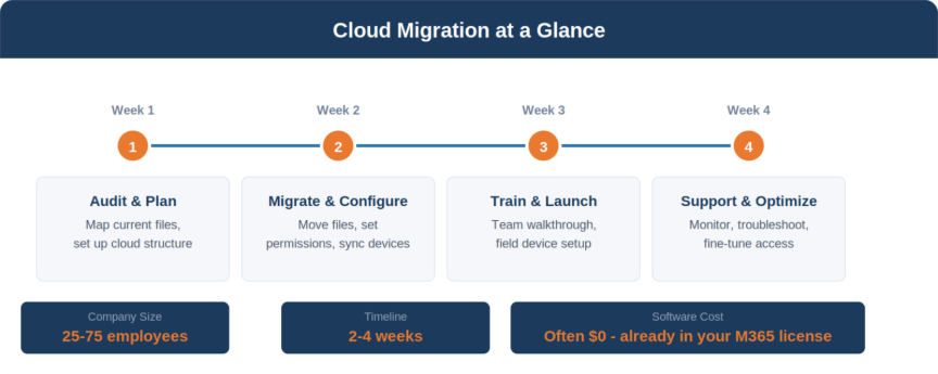 For a typical construction company with 25 to 75 employees, a cloud file migration takes 2 to 4 weeks. This includes moving your existing file structure, setting up permissions, configuring field devices, and training your team. Your day-to-day operations continue normally during the migration.